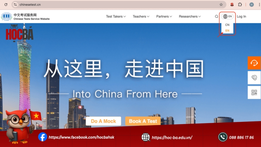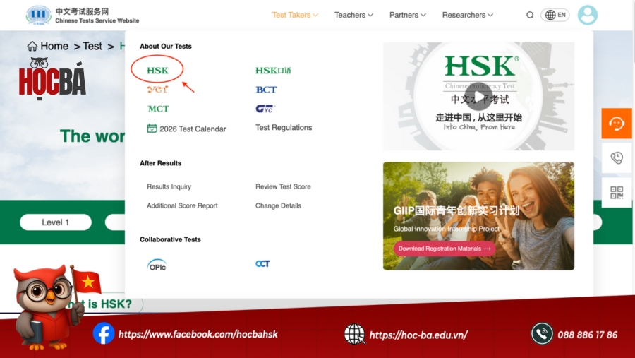Trên thanh menu của trang chủ, bạn chọn Test Takers. Tại About Our Tests, thí sinh tiếp tục chọn vào biểu tượng “HSK” nếu chỉ thi HSK 3 (Nghe, Đọc, Viết).