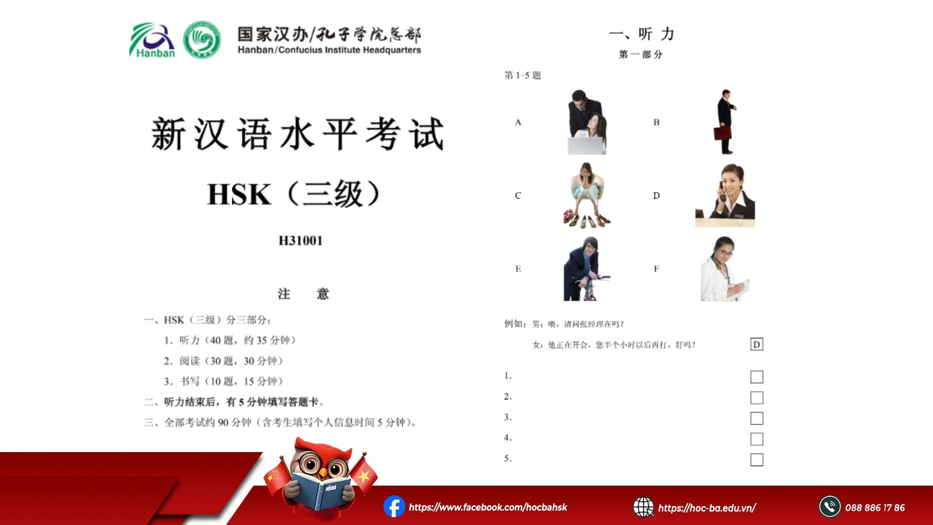 Đề HSK 3 H31001 chuẩn theo format đề thi thật là tài liệu hữu ích cho bất kỳ ai đang chuẩn bị thi HSK 3. Thông qua việc luyện đề H31001, bạn sẽ làm quen với dạng câu hỏi, nâng cao kỹ năng phản xạ ngôn ngữ và cải thiện tốc độ làm bài. Hãy cùng Học Bá giải đề (kèm phiên âm + dịch nghĩa) để tự rút ra kinh nghiệm và tự tin chinh phục kỳ thi HSK 3!