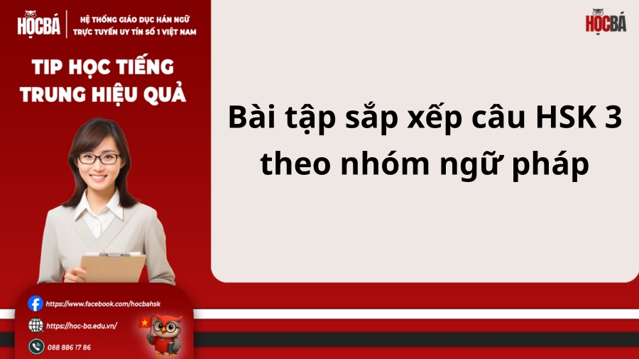 Kỹ năng sắp xếp từ thành câu hoàn chỉnh là một thử thách quen thuộc ở trình độ HSK 3. Luyện tập theo nhóm ngữ pháp giúp người học ghi nhớ cấu trúc nhanh hơn và phản xạ tự nhiên hơn. Phương pháp này giúp bạn hiểu bản chất ngữ pháp, xác định khung câu rõ ràng khi gặp từ ngữ lộn xộn, đồng thời tối ưu lộ trình học bằng cách tập trung vào những điểm ngữ pháp còn yếu.
